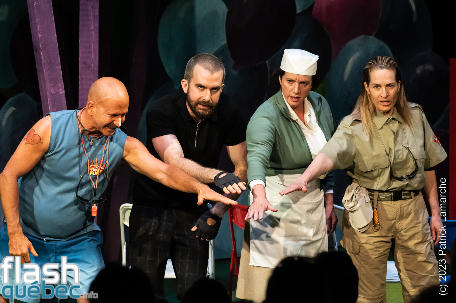La mise en scène de Boudreault est efficace, plusieurs éléments comme celui au retour de l’entracte sont surprenants et très drôles. Les comédiens sont bons et nous font apprécier leurs personnages même si quelques-uns semblent à prime abord détestables. Bien sûr, tout ça est grossi et exagéré afin de nous démontrer les travers humains au profit du rire.
