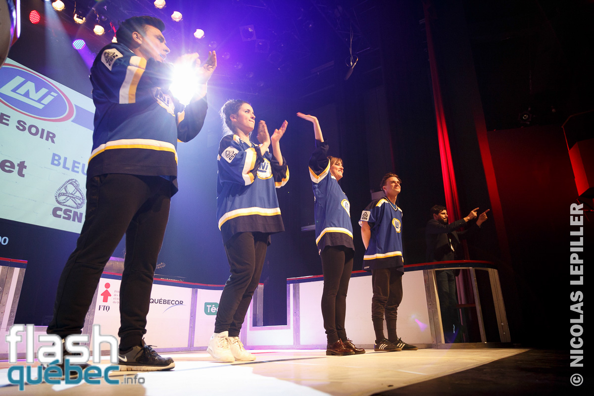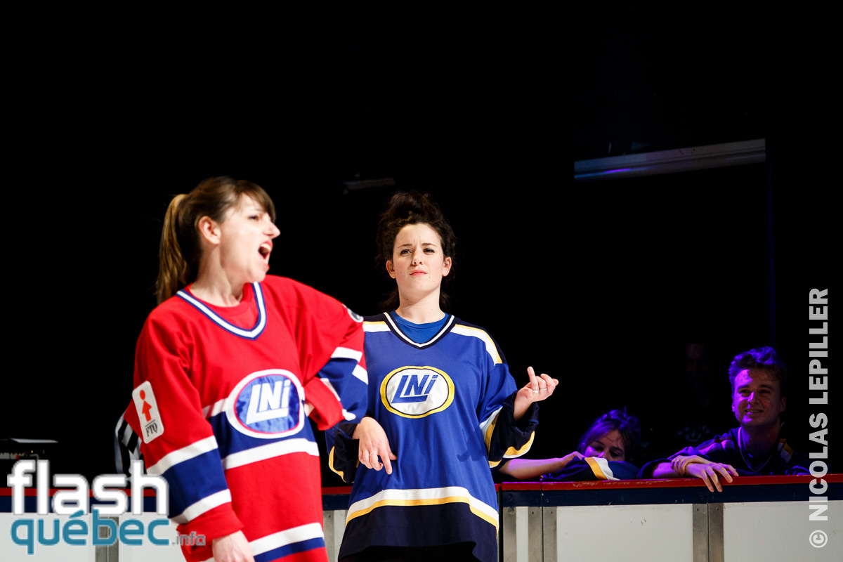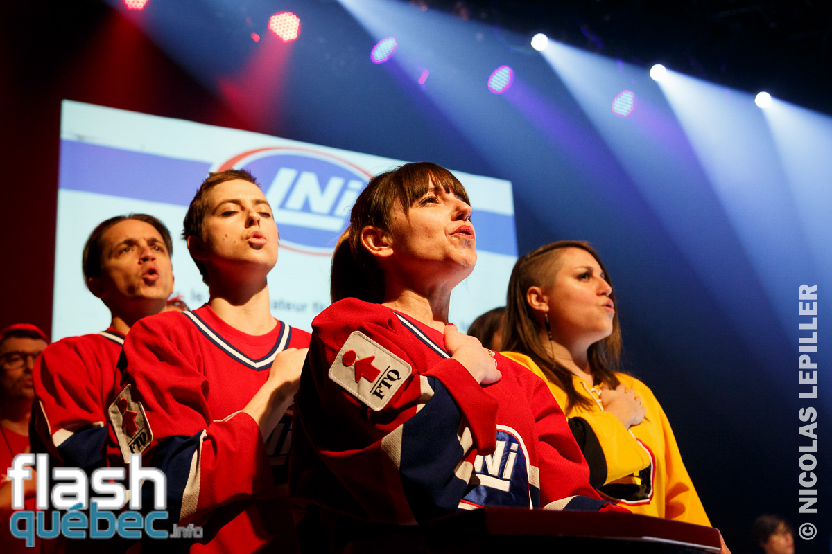 C’est lundi soir le 8 février dernier qu’avait lieu l’ouverture de la saison 2016 de la LNI (Ligue nationale d’improvisation), au Club Soda à Montréal. C’est dans une ambiance électrique que des centaines de personnes se sont rassemblées pour lancer cette saison! L’ouverture a été marquée par la présence (presque complètes mise à part l’équipe des jaunes qui brillait par l’absence de trois membres, dont sa nouvelle recrue Patrick Huard) des cinq équipes et leurs propriétaires: les Bleus CSN (Christian Laurence (entraîneur), Frédéric Basbusci, Réal Bossé, Virginie Fortin et Florence Longpré), les Rouges FTQ (Jean-Philippe Durand (entraîneur), Simon Boudreault, Lelouis Courchesne, Ève Landry et Diane Lefrançois), les Jaunes Québécor (Benoît Chartier (entraîneur), Patrick Huard, Marie-Ève Morency, Jean-François Nadeau et Joëlle Paré-Beaulieu), Les Oranges Atelier Ville Architecture Paysage (René Rousseau (entraîneur), Jean-François Aubé, Sophie Caron, Pier-Luc Funk et Amélie Geoffroy) et les Verts Taxi Téo (Christian Brisson-Dargis (entraîneur), Salomé Corbo, Johanne Lapierre, Mathieu Lepage et Laurent Paquin). Après l’épique hymne nationale chantée en choeur par toutes les équipes, les Rouges et les Bleus ont commencé le match!