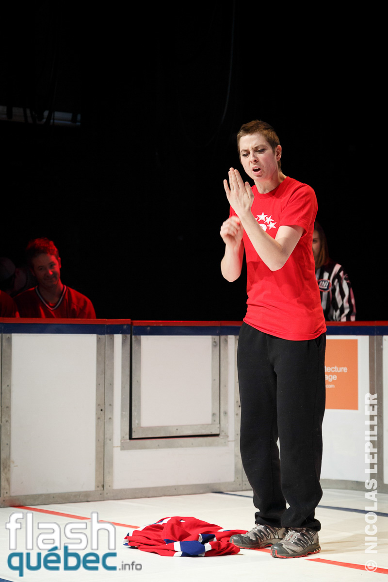 Ce fut une soirée marquée par le plaisir de jouer, l’engouement des spectateurs envers l’improvisation et l’amour pour cet art! C’est la folie de Virginie Fortin, pendant la première partie, qui a marqué bien des gens pendant cette soirée… Elle nous a livré une improvisation de cinq minutes mettant en scène une Céline Dion obligée de monter sur scène suite au décès de René. C’était franchement hilarant! Il n’y a pas eu qu’elle qui a impressionné, on peut souligner l’intelligence et la vivacité d’esprit de Frédéric Barbusci, Lelouis Courchesne et Ève Landry, pour ne nommer que ceux-là! Le seul petit bémol: le son. Sur scène on peut y voir des micros suspendus pour améliorer l’acouphène de la salle de spectacle, mais lorsque l’on est assis loin derrière, les chances de devoir tendre l’oreille s’agrandissent! En effet, le son est à mi-chemin entre une représentation théâtrale et un spectacle (avec micro). Du coup, cela peut devenir irritant si l’on a quelconque problème d’ouïe et que l’on est placé vers l’arrière. Sinon, rien à dire de mal! Entre les parties (il y en a trois) nous avons accès au service de bar si l’on veut se rafraîchir, les charmants employés passent partout dans la salle pour s’assurer que personne ne manque de rien!