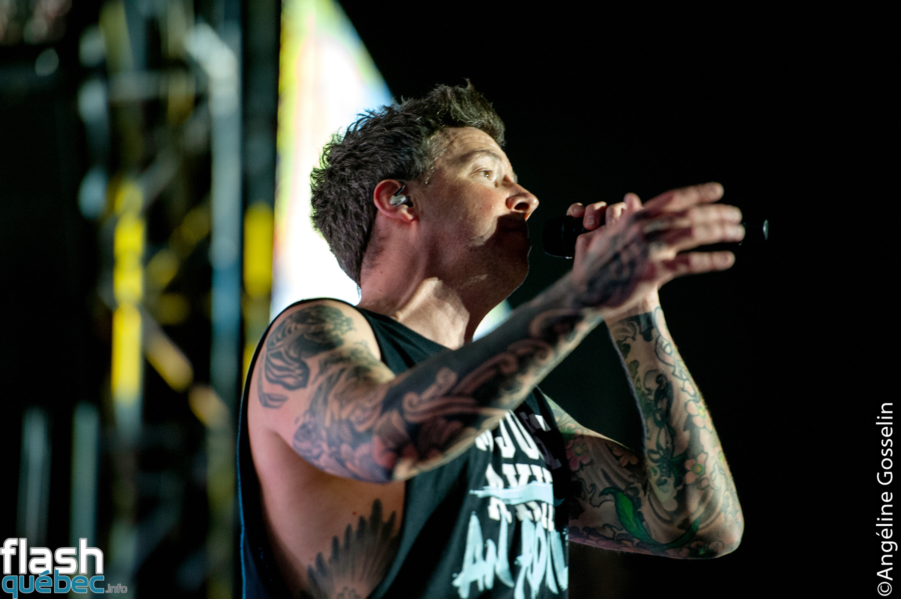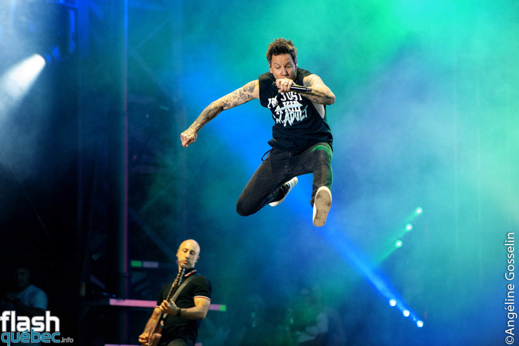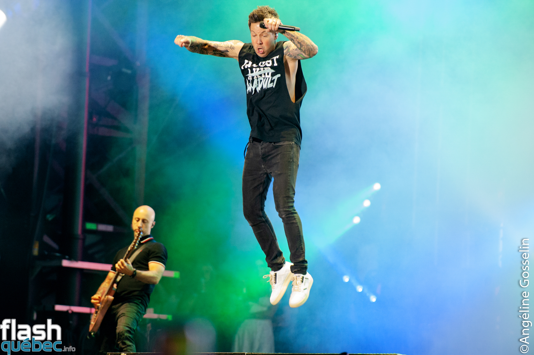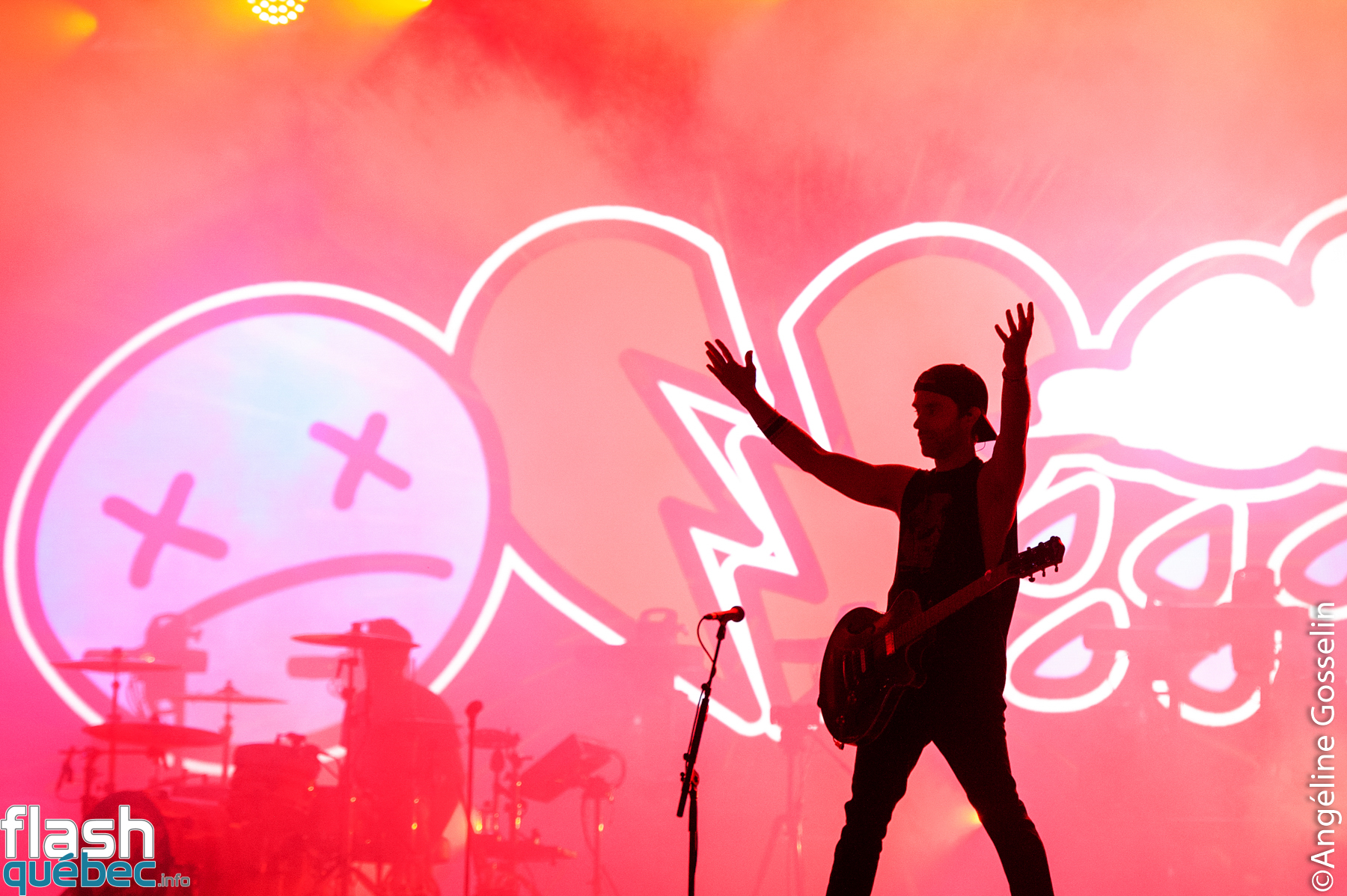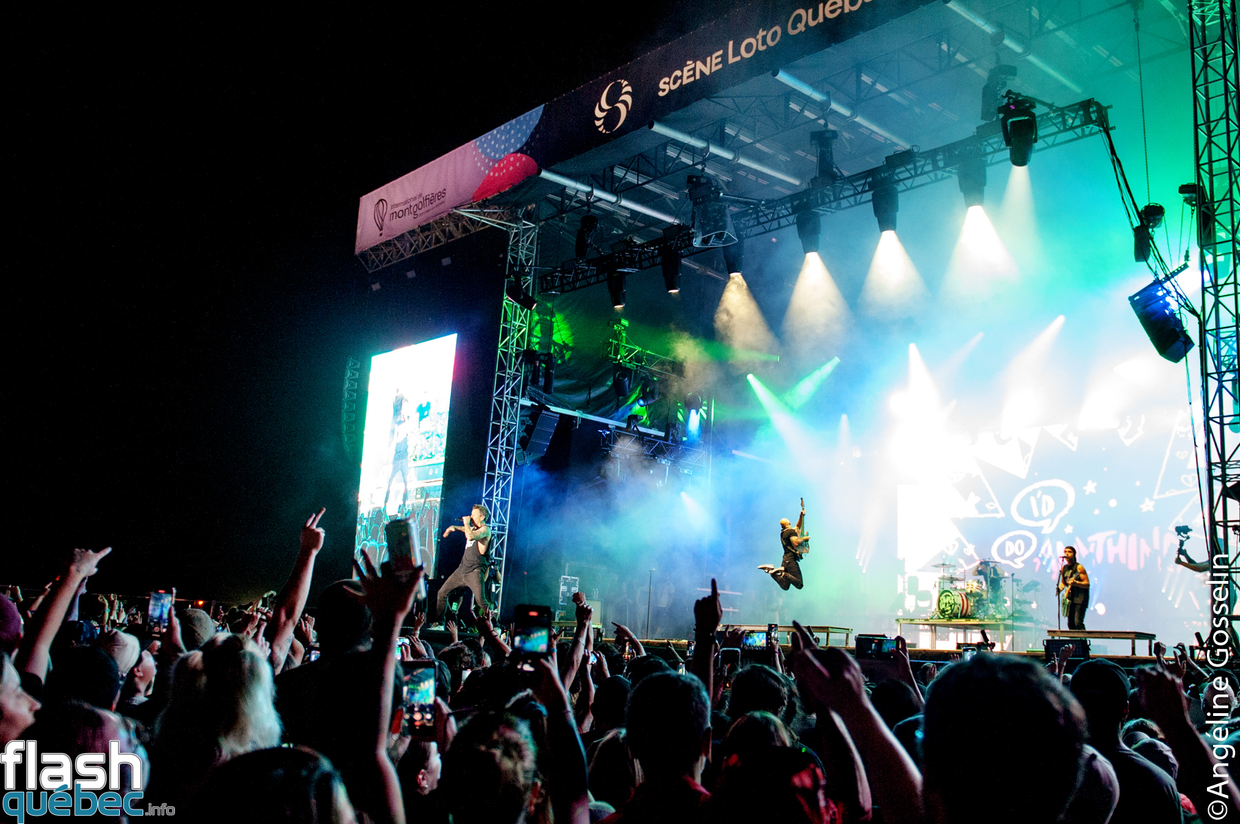 Pierre, Chuck, Jeff et Sébastien de Simple Plan ont pris possession de la scène Loto-Québec jeudi soir à l’international des Montgolfières de Saint-Jean-sur-Richelieu devant une armée de fans fidèles, dans une foule immensément dense.