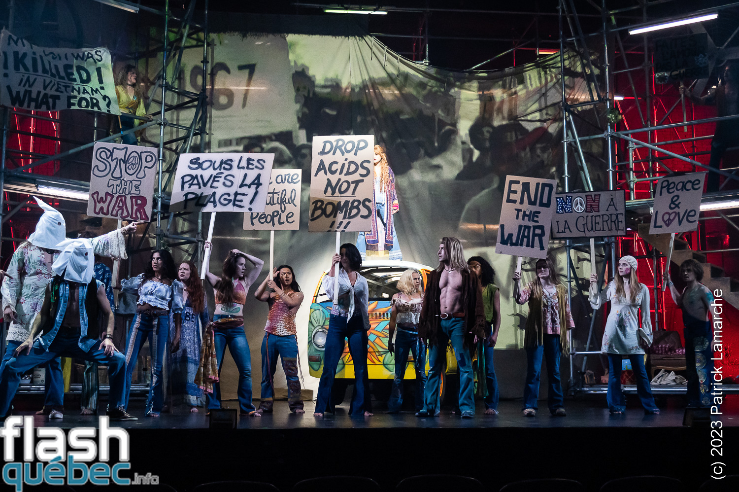Oeuvre phare de la contre-culture des années 60, Hair aborde des thèmes qui résonnent encore aujourd’hui, et son message d’espoir, d’amour et de paix reste plus que jamais d’actualité. Avec son adaptation, le metteur en scène Serge Denoncourt compte bien explorer avec passion, humour et parfois ironie, les codes et valeurs peace and love, tel un polaroïd historique.