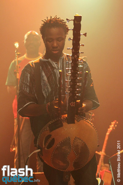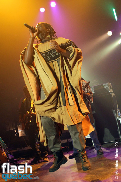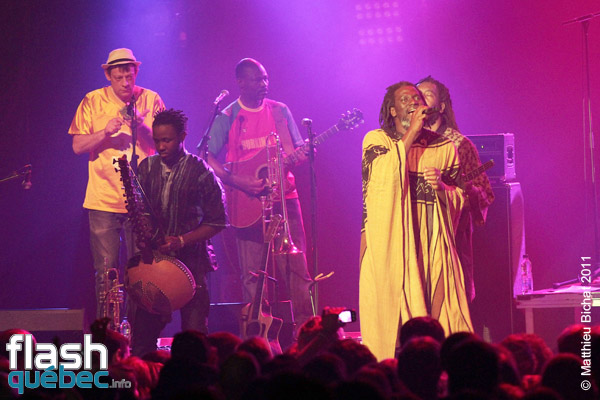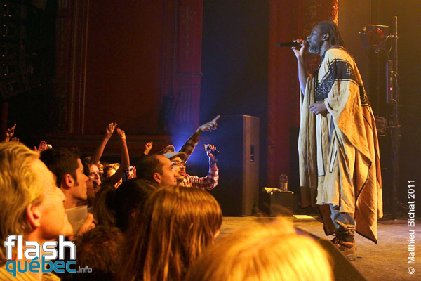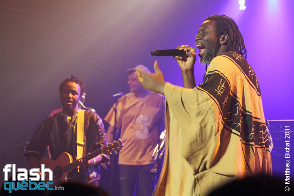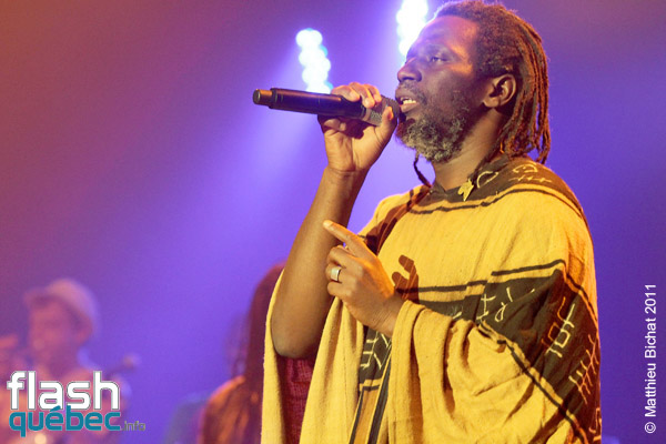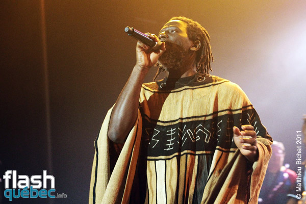 Pour les 25 ans du Festival Nuits d’Afrique, la production n’a pas lésiné en réussissant à faire venir deux soirs de suite à guichets fermés nul autre que la star africaine du reggae, déjà devenu légende vivante, Monsieur Tiken Jah Fakoly. Après plus de 15 ans de carrière et 10 albums, celui que plusieurs considèrent déjà comme le nouveau Bob Marley ou Alpha Blondy, accumule déjà déjà les honneurs avec  trois disques d’or, une Victoire de la musique en 2003, et un prix du Miroir de la Chanson d’expression française en 2007 et ce n’est qu’un début…Sa popularité ne cesse de grandir à travers le monde et c’est tant mieux pour la cause africaine! Le message de M.Fakoly doit être entendu par tous, pour qu’un jour se fasse la Révolution Africaine. Tiken Jah dénonce à travers ses albums aux sonorités afro-reggae, les abus de la classe politique de son pays la Côte-d’Ivoire (dont il est en exil depuis plusieurs années pour sa sécurité). Les dirigeants africains profitent de la naïveté de leur peuple pour s’enrichir personnellement, avec la complicité de certains états occidentaux. Comme le clame le chanteur ”Il faut se lever pour changer tout ça” et lance un message clair et fort aux dirigeants, notamment dans la chanson ”Quitte le pouvoir”. Pour lui, le changement en Afrique doit venir des africains et de personne d’autre. Et la clé de ce changement est l’éducation du peuple. Sans éducation, les africains se font avoir par leurs dirigeants et par les pays qui profitent des richesses de la Terre Mère  pour une bouchée de pain. La révolution est en marche depuis que Tiken Jah a pris le micro, il est la voix rassembleuse de tout un peuple persécuté. Pour en revenir au spectacle, le généreux artiste a offert plus de deux heures de prestation aux montréalais qui en redemandaient! Bien sûr presque tous les titres de son dernier album, du même nom que la tournée, y sont passé. Le Lion africain, égal à lui-même, débordant d’énergie parcourait la scène de long en large en courant au rythme de ses mélodies, portées par ses 9 musiciens et 2 choristes. Entre les chansons, il n’a pas hésité à passer son message d’une voix grave, profonde, sincère. Dans un Théâtre Olympia plein, l’artiste a fait résonner ses grands succès engagés dans un superbe medley, tels que ”Justice”, ”Y’en a marre”, ”Françafrique”, ”Le pays va mal” ou encore” Délivrance”, et dont les fans reprenaient en choeur le refrain. Au bout d’environ une heure de spectacle, le rythme et les cuivres sont tombés pour laisser place à un Tiken Jah calme et serein, mais non moins profond. Assis sur un tabouret il a  interprété des versions plus douces, différentes mais tout aussi réussies, des titres ”Plus rien ne m’étonne”, ”Je dis non!”, ”Political war” et plusieurs autres… avant de refaire voler sans les airs son boubou africain (sorte de grand poncho) pour la dernière partie du spectacle. Chose certaine, nous n’avons pas fini d’entendre parler de Tiken Jah Fakoly et de son combat pour la délivrance du peuple africain…Matthieu Bichat pour Flashquébec.